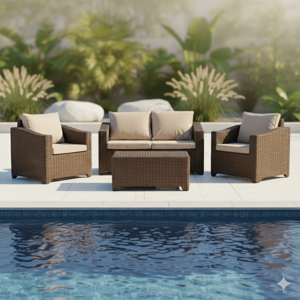 Izrađen od visokokvalitetnog pseudo ratana, ovaj set je izdržljiv i dugotrajan. Materijal je otporan na vremenske uslove, što znači da će zadržati svoj izgled i funkcionalnost tokom godina. Pored toga, ratan je poznat po svojoj otpornosti na UV zračenje, što dodatno doprinosi njegovoj dugovečnosti.